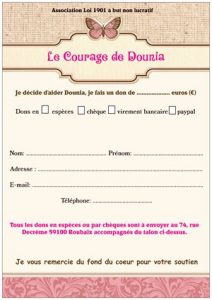 Vous pouvez nous soutenir en vous abonnant et en partageant notre page Facebook “Le Courage de Dounia” et/ou en faisant un don directement à l’association (voir la rubrique Don).